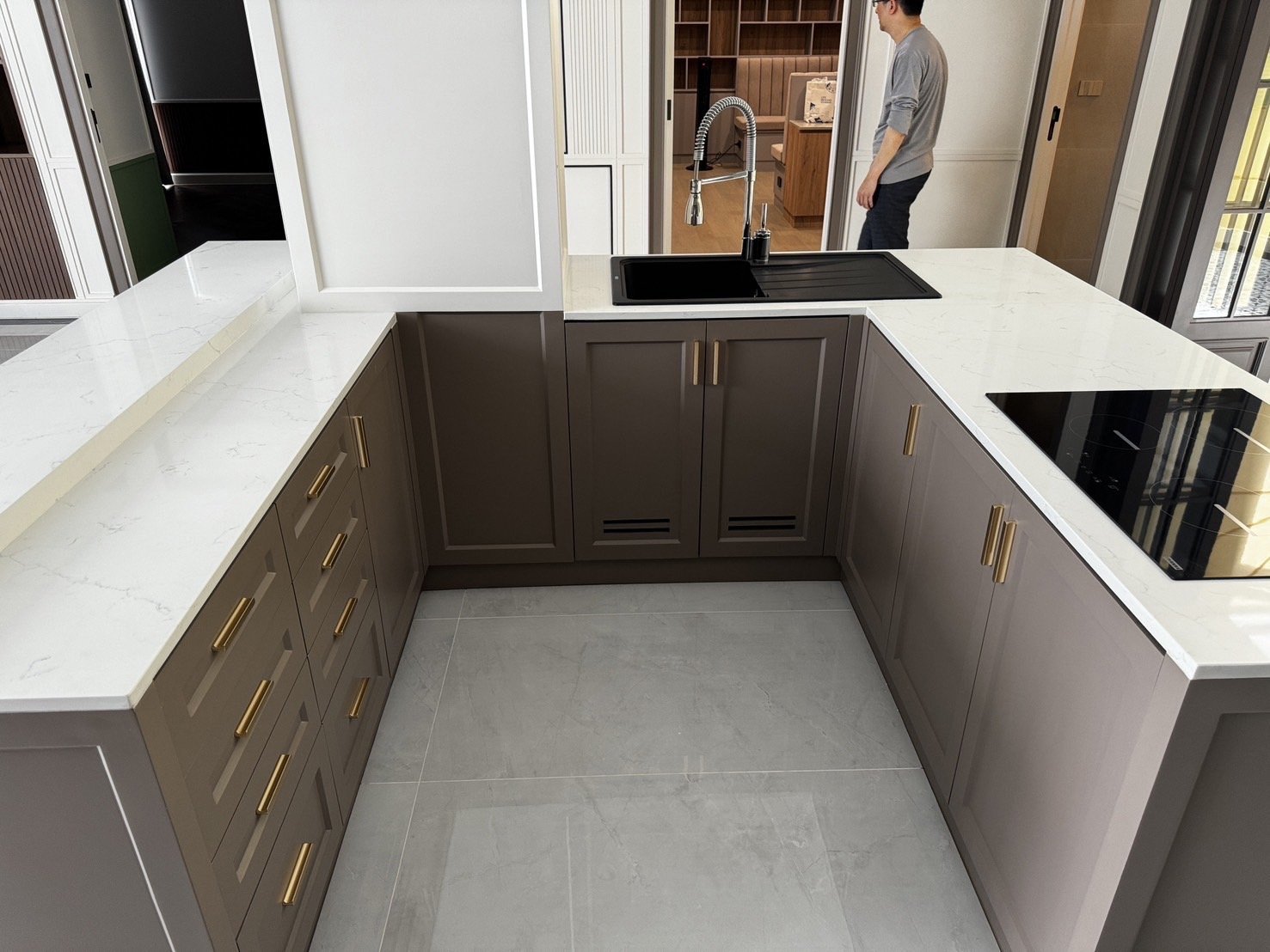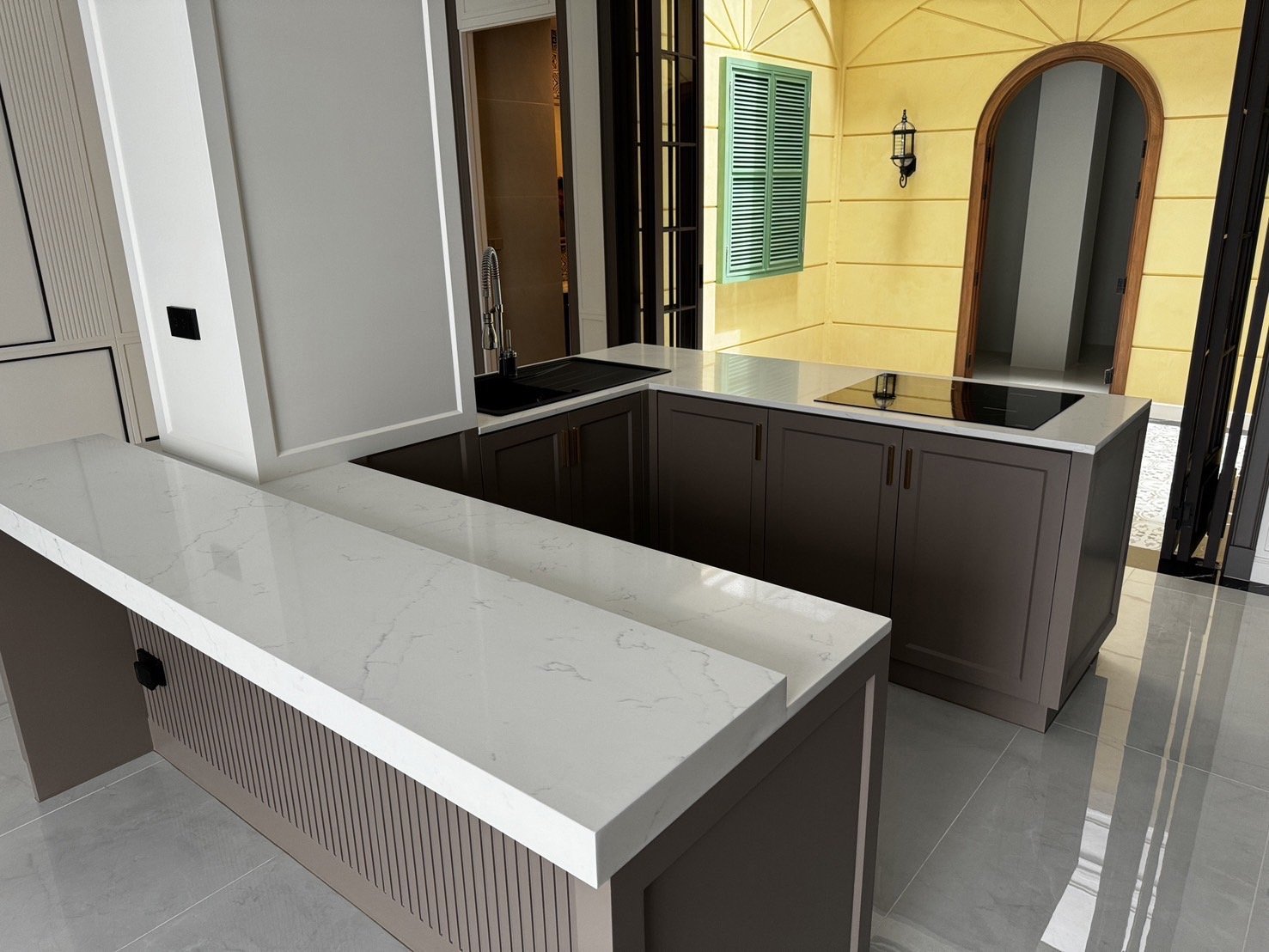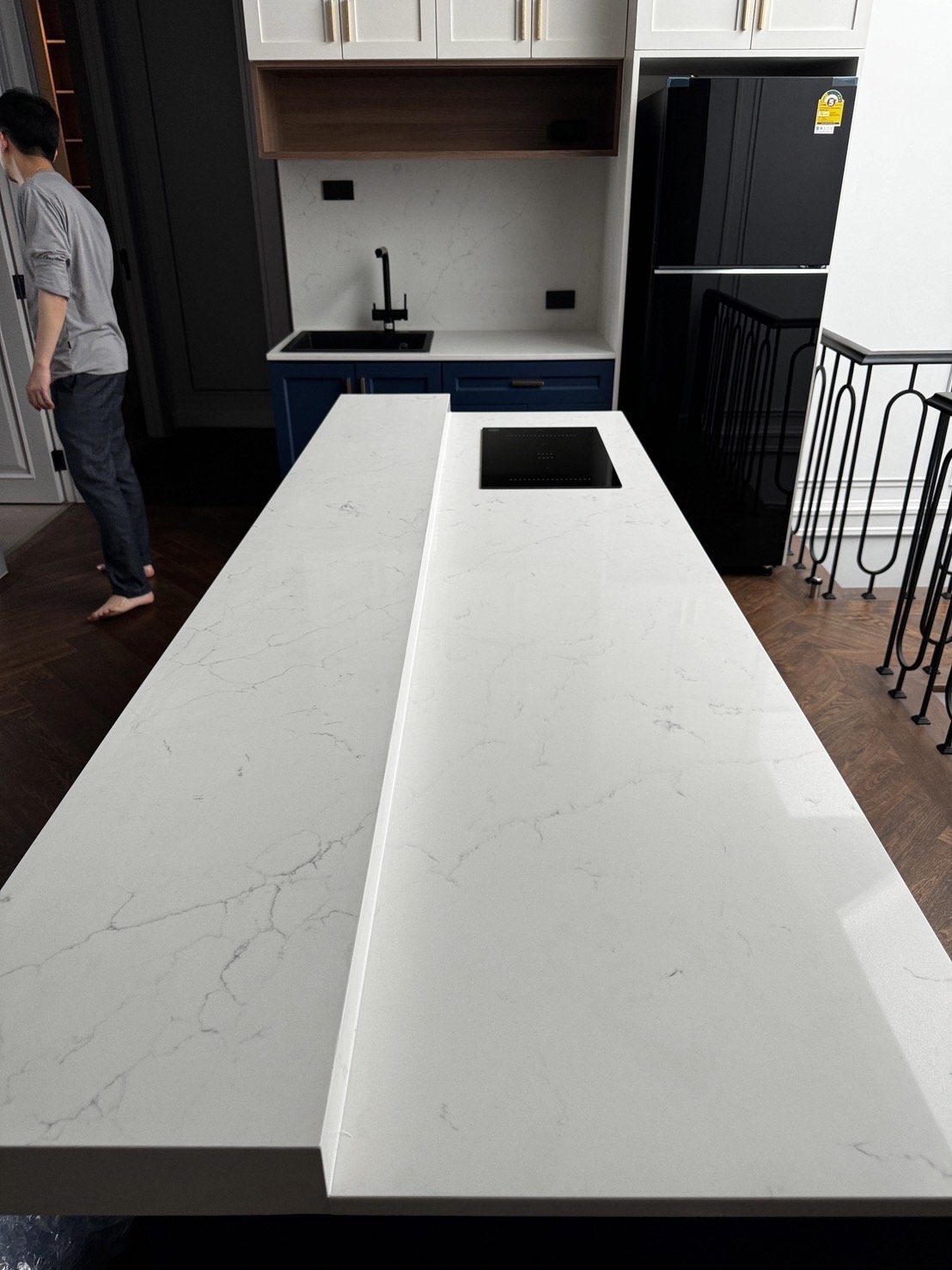งาน custom หินควอตซ์ หมู่บ้าน Niche แจ้งวัฒนะ ด้วยคุณสมบัติที่แข็งแรง และผิวหน้าที่ทนทาน เหมาะกับครัวไทยและพื้นที่ที่ต้องการใช้งานอย่างหนักหน่วง