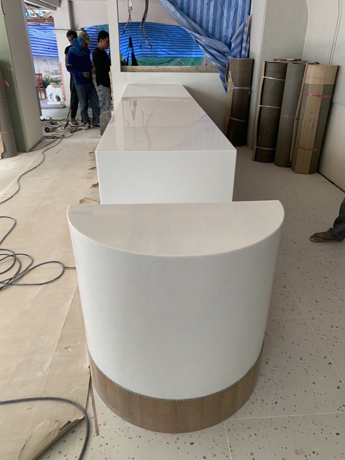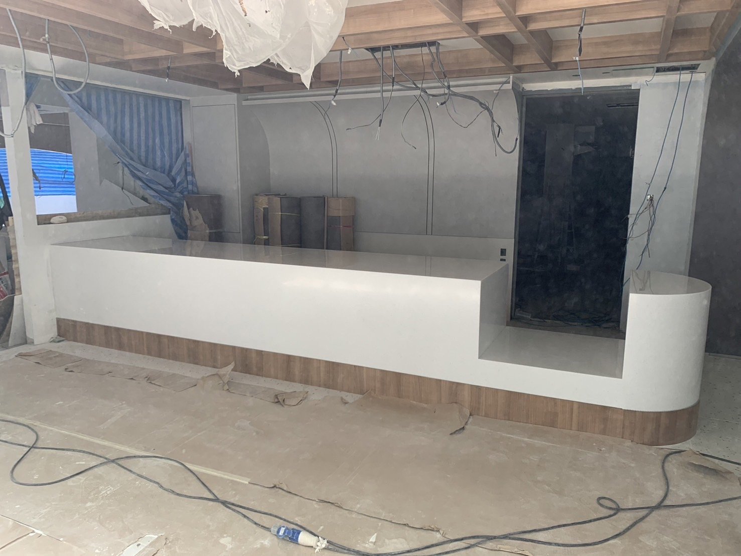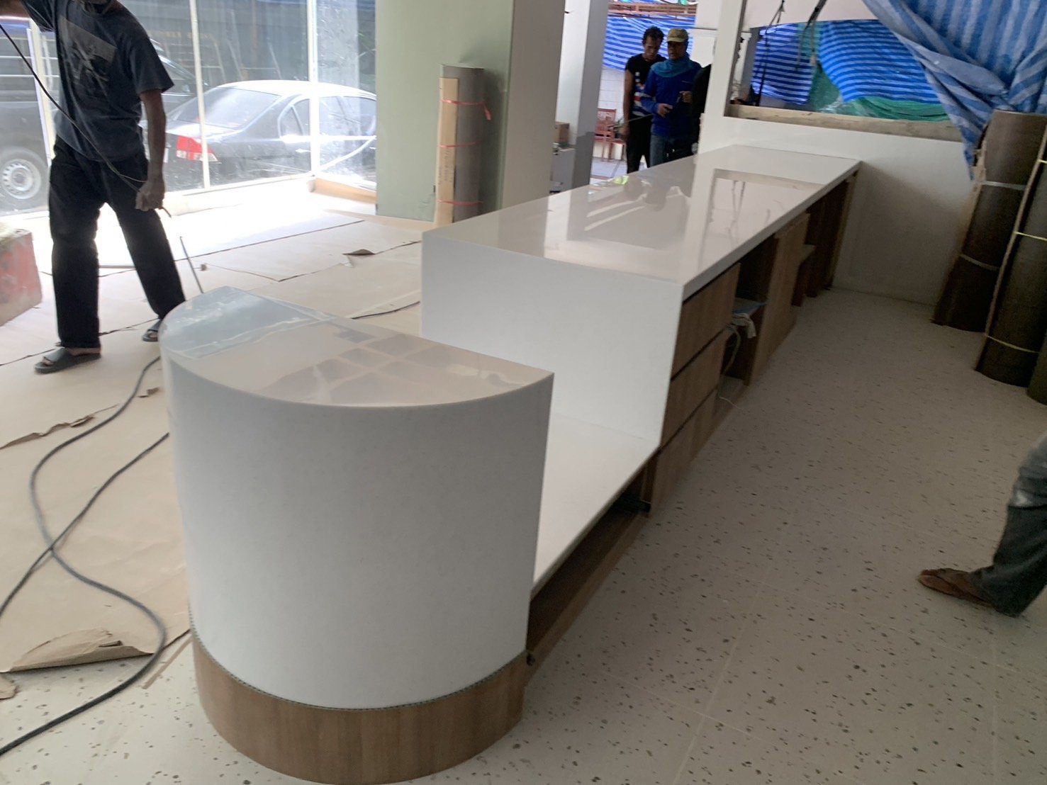 งานหินสังเคราะห์ รหัส S309 ด้วยคุณสมบัติเด่นที่สามารถดัดโค้งได้ เหมาะสำหรับทำเคาน์เตอร์บาร์หรือเคาน์เตอร์ประชาสัมพันธ์ที่ต้องการความสวยงามและความทนทานในเวลาเดียวกัน