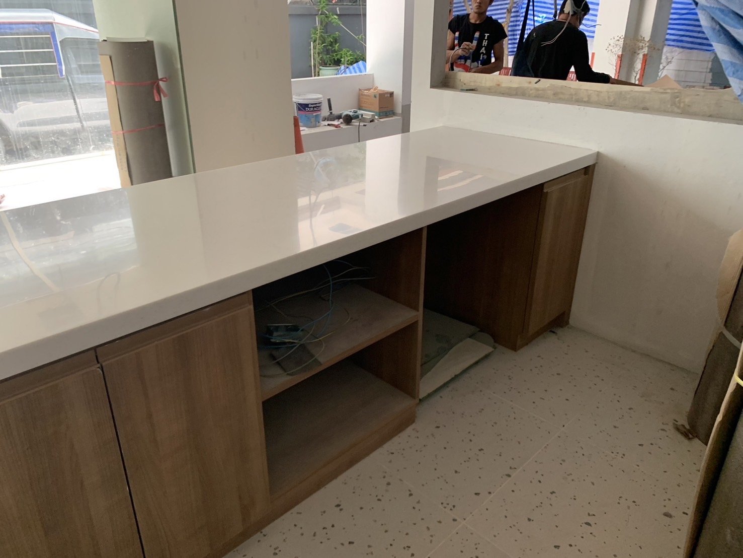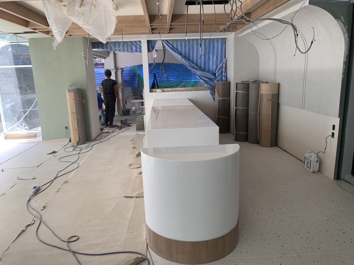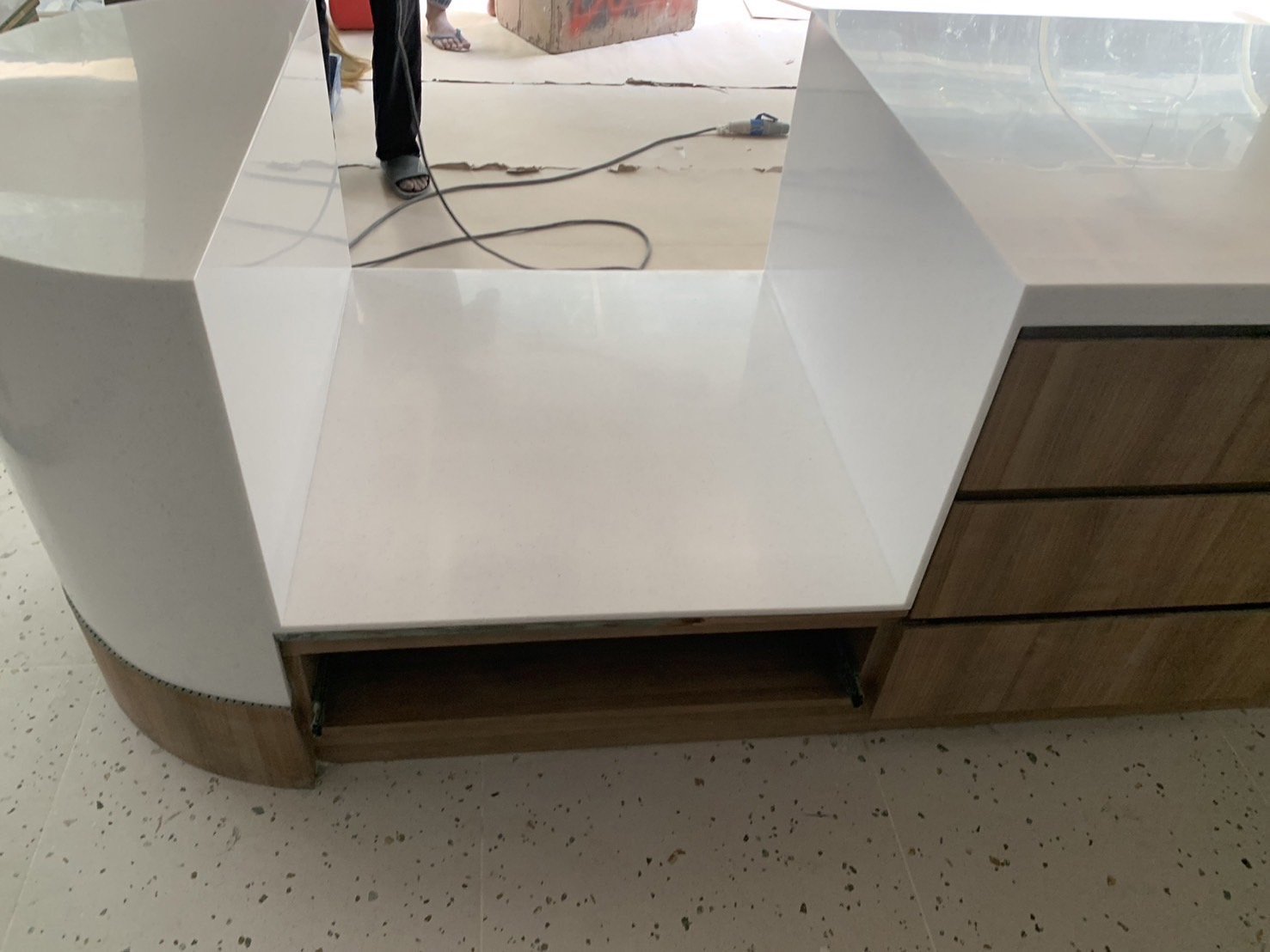 งานหินสังเคราะห์ รหัส S309 ด้วยคุณสมบัติเด่นที่สามารถดัดโค้งได้ เหมาะสำหรับทำเคาน์เตอร์บาร์หรือเคาน์เตอร์ประชาสัมพันธ์ที่ต้องการความสวยงามและความทนทานในเวลาเดียวกัน