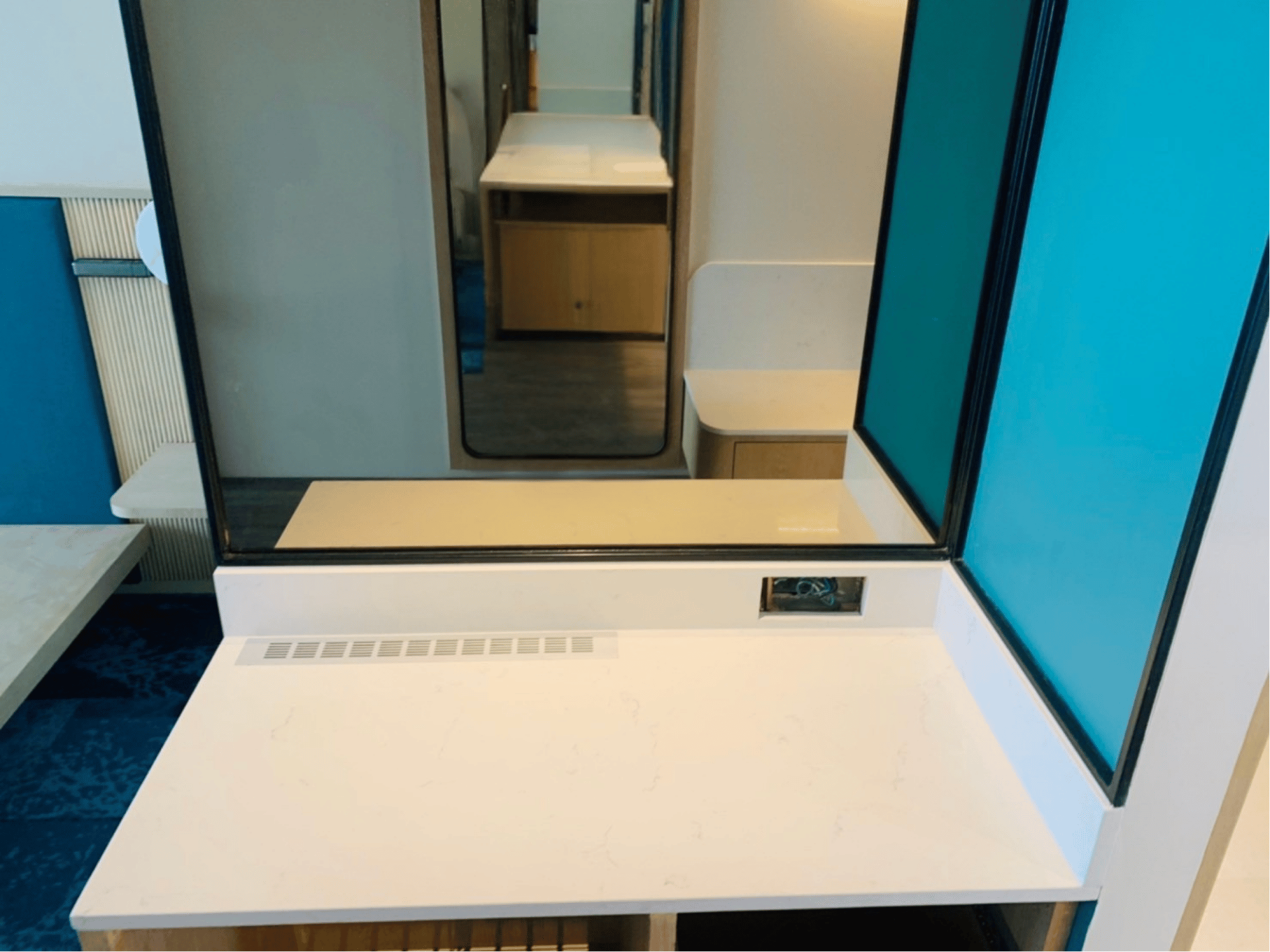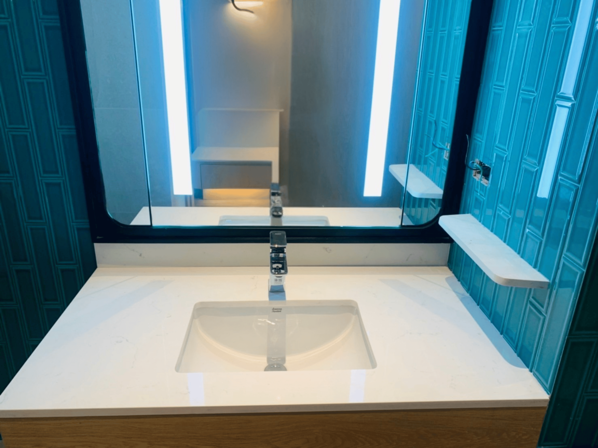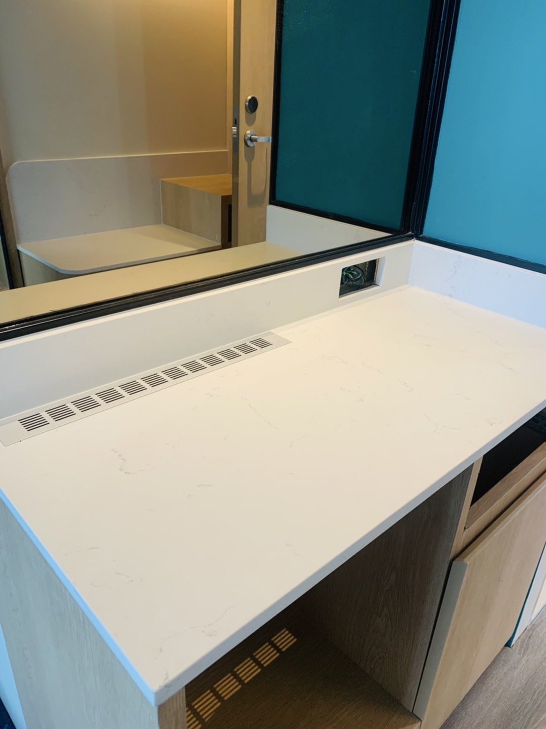 หินสังเคราะห์ในโครงการ Hilton garden inn Pattaya ที่นำมาทำเป็นท็อปอ่างล้างหน้าและโต๊ะเครื่องแป้ง ด้วยคุณสมบัติผิวหน้าที่ไม่มีรูพรุน ทำให้ไม่ดูดซับน้ำ ทนต่อคราบสิ่งสกปรก