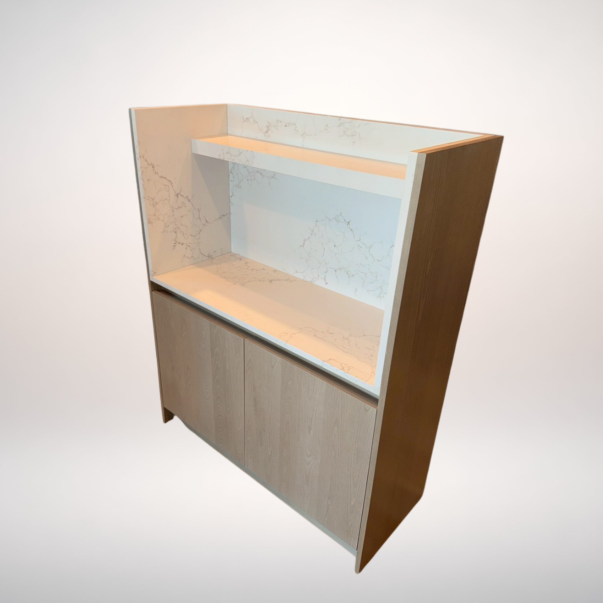 ตู้เก็บของอเนกประสงค์ปิดผิวด้วยไม้วีเนียร์ลวดลายธรรมชาติ ด้านบนใช้ท็อปเป็นหินควอตซ์สีขาวแทรกลายแร่หินแท้ แข็งแรง ทนต่อรอยขีดข่วนได้ดี สามารถวางสิ่งของที่มีน้ำหนักมากได้แบบไร้กังวล