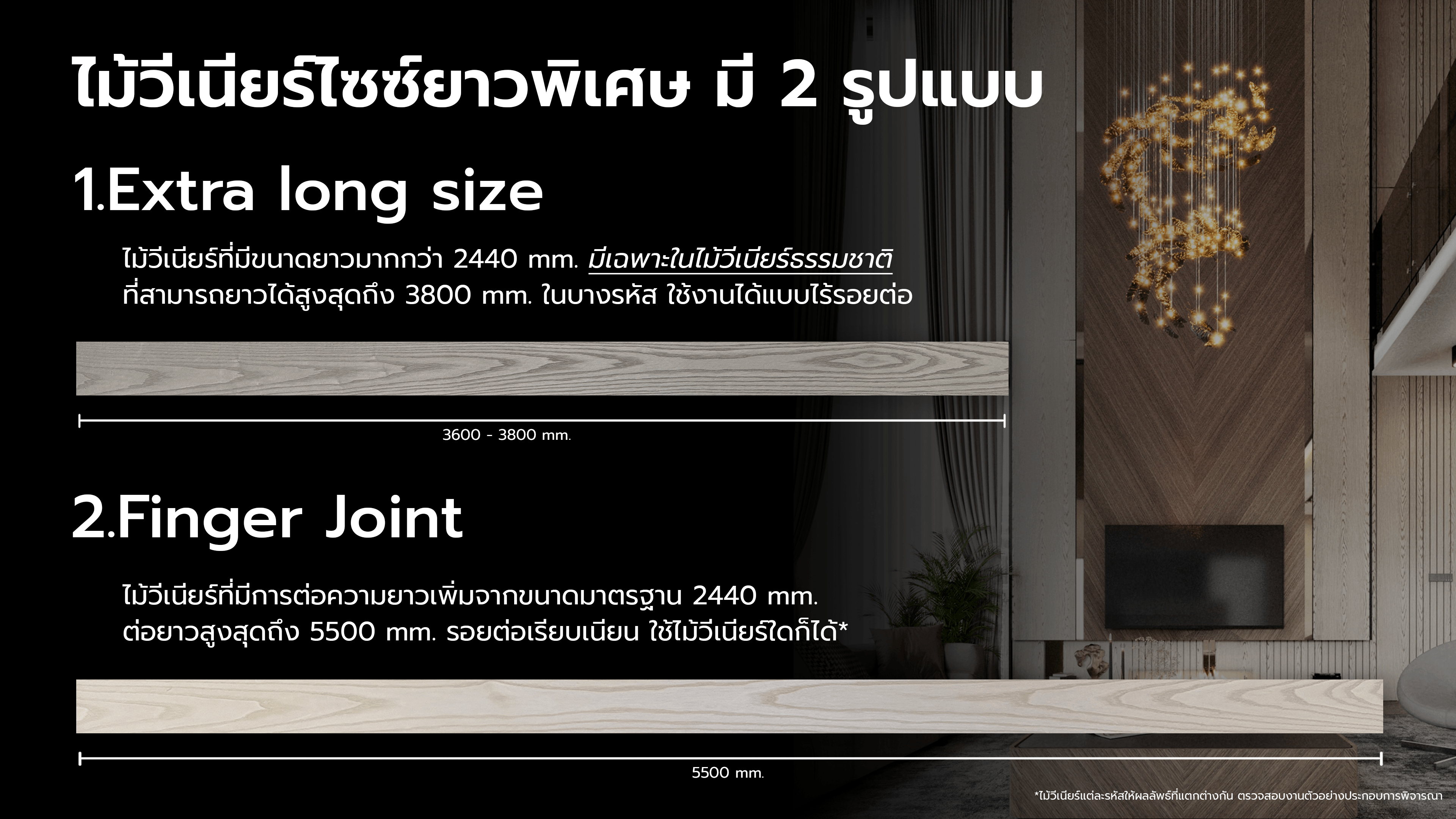 ไม้วีเนียร์ที่มีขนาดยาวมากกว่า 2440 mm. ซึ่งมีเฉพาะในไม้วีเนียร์ธรรมชาติ ที่สามารถยาวได้สูงสุดถึง 3800 mm. ในบางรหัส ใช้งานได้แบบไร้รอยต่อ