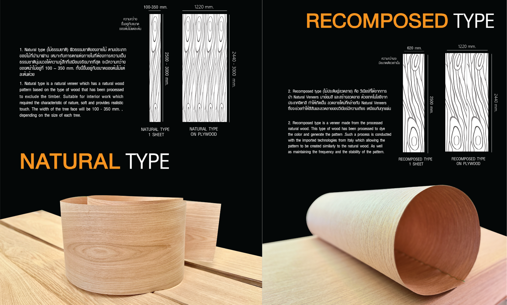 2.Recomposed type คือ วีเนียร์ที่มาจากการฝานไม้ธรรมชาติ จากป่าไม้ที่ได้รับการจัดการทรัพยากรอย่างเป็นระบบ ผ่านกระบวนการย้อมสีและประดิษฐ์ลวดลาย ด้วยเทคโนโลยีจากประเทศอิตาลี ทำให้สามารถสร้างลวดลายที่ใกล้เคียงกับไม้ธรรมชาติรวมไปถึงการรักษาความคงที่และความสม่ำเสมอของลวดลาย รวมทั้งยังสามารถสร้างลวดลายต่างๆได้ตามจินตนาการ